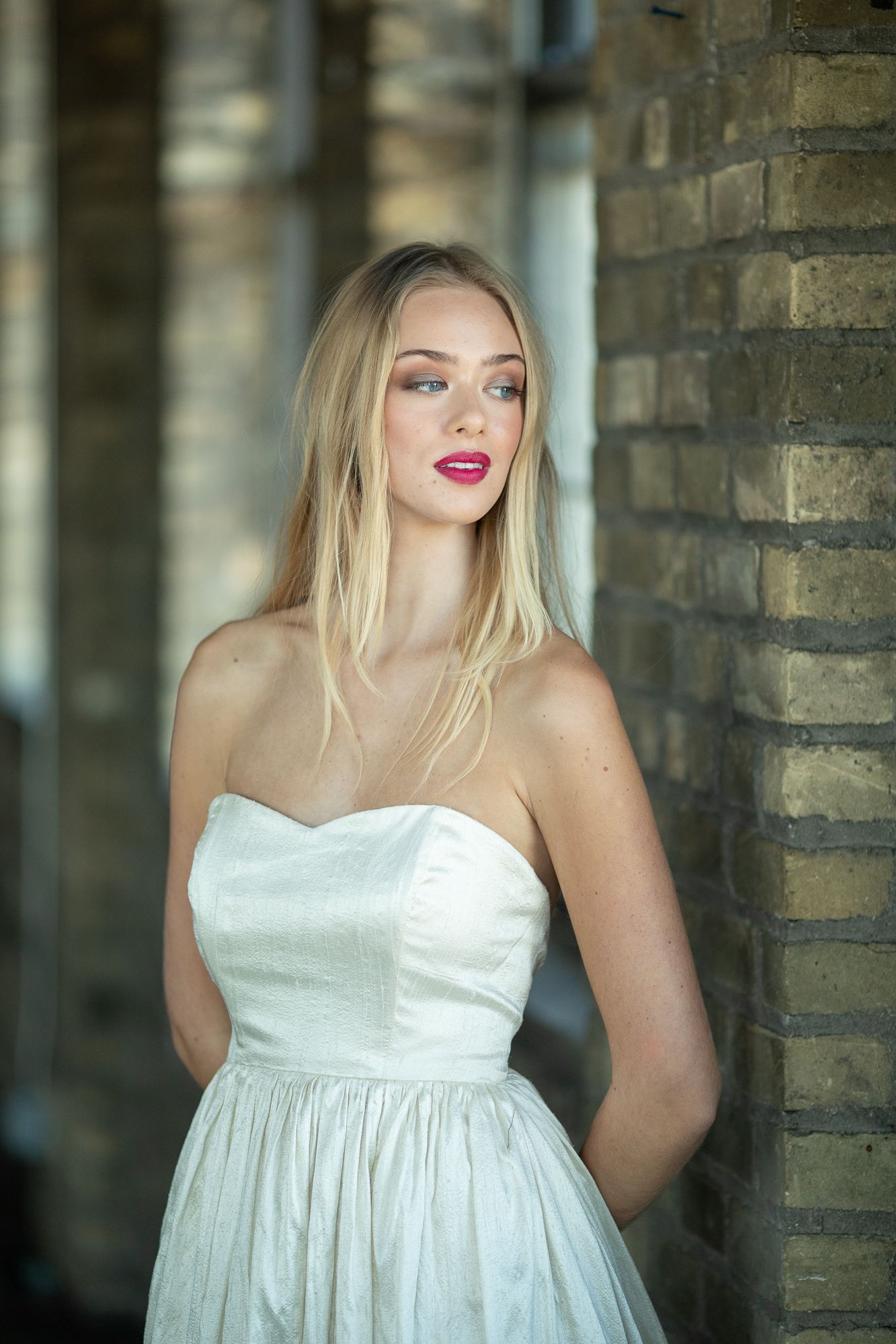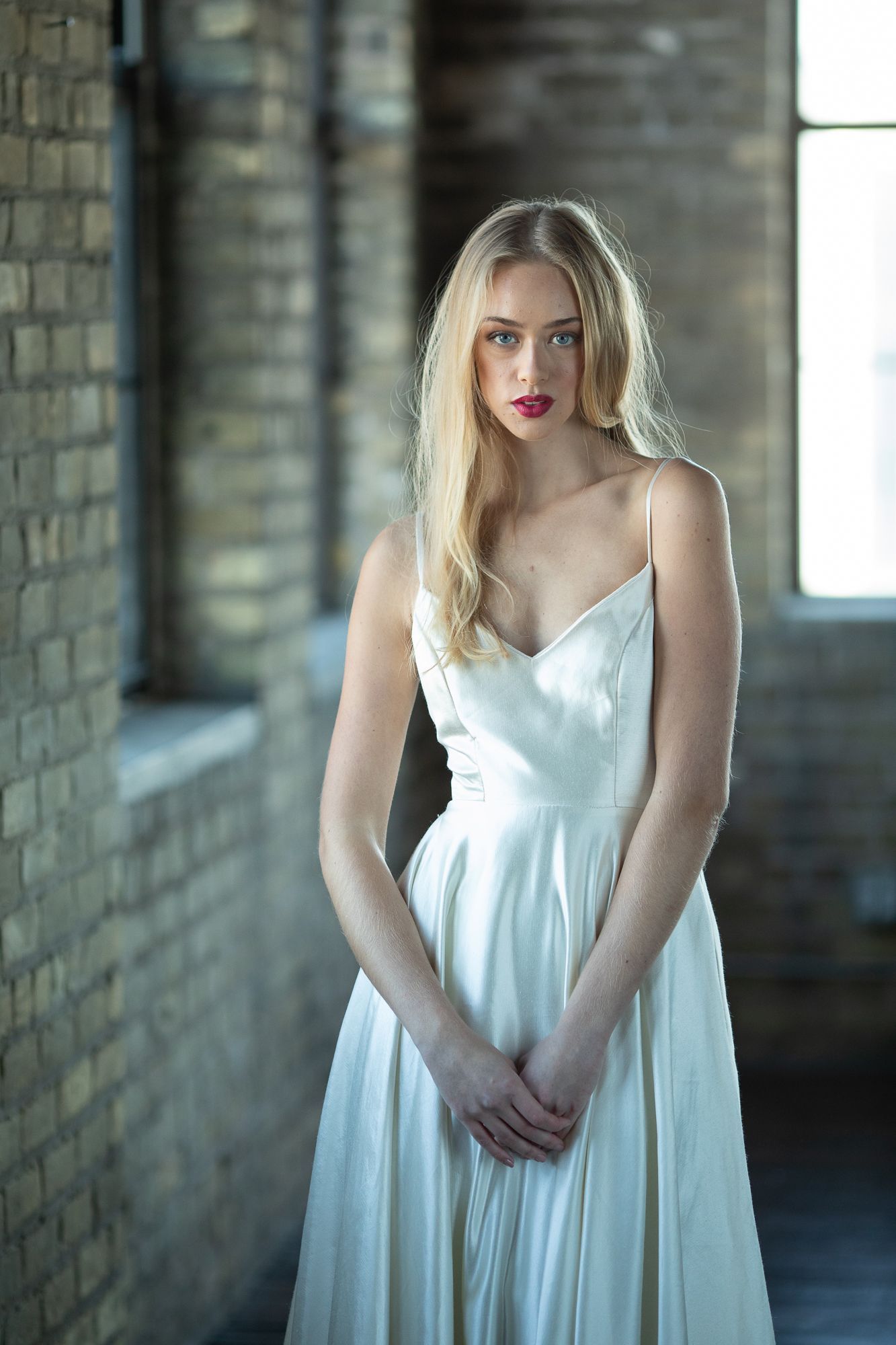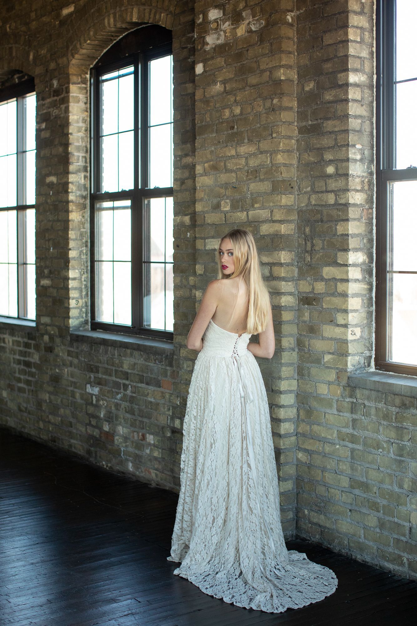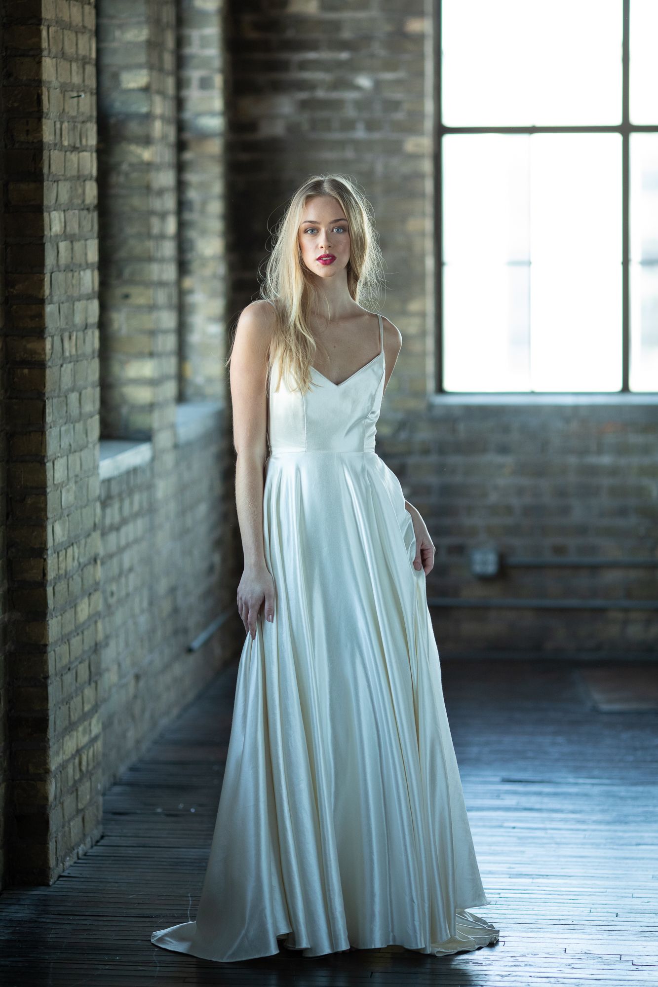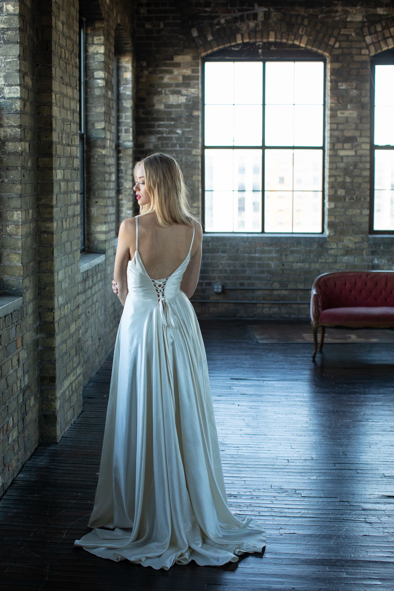 Raw silk and cotton lining. Slight sweetheart neckline and low back with chapel train.